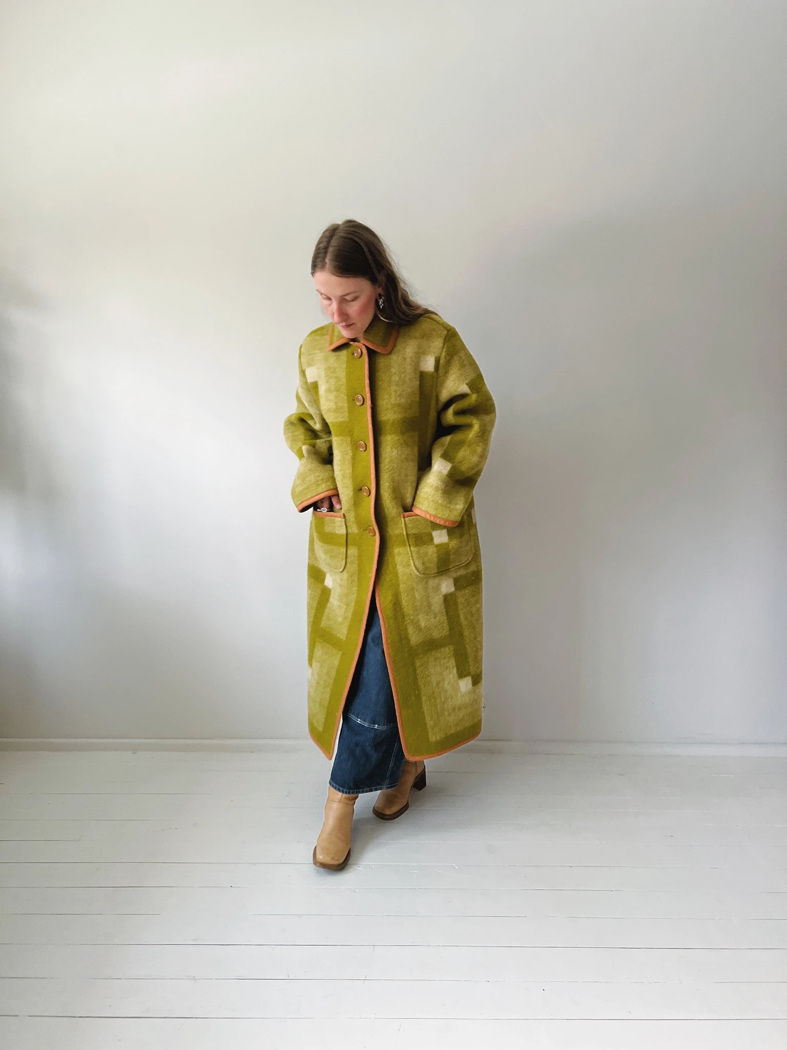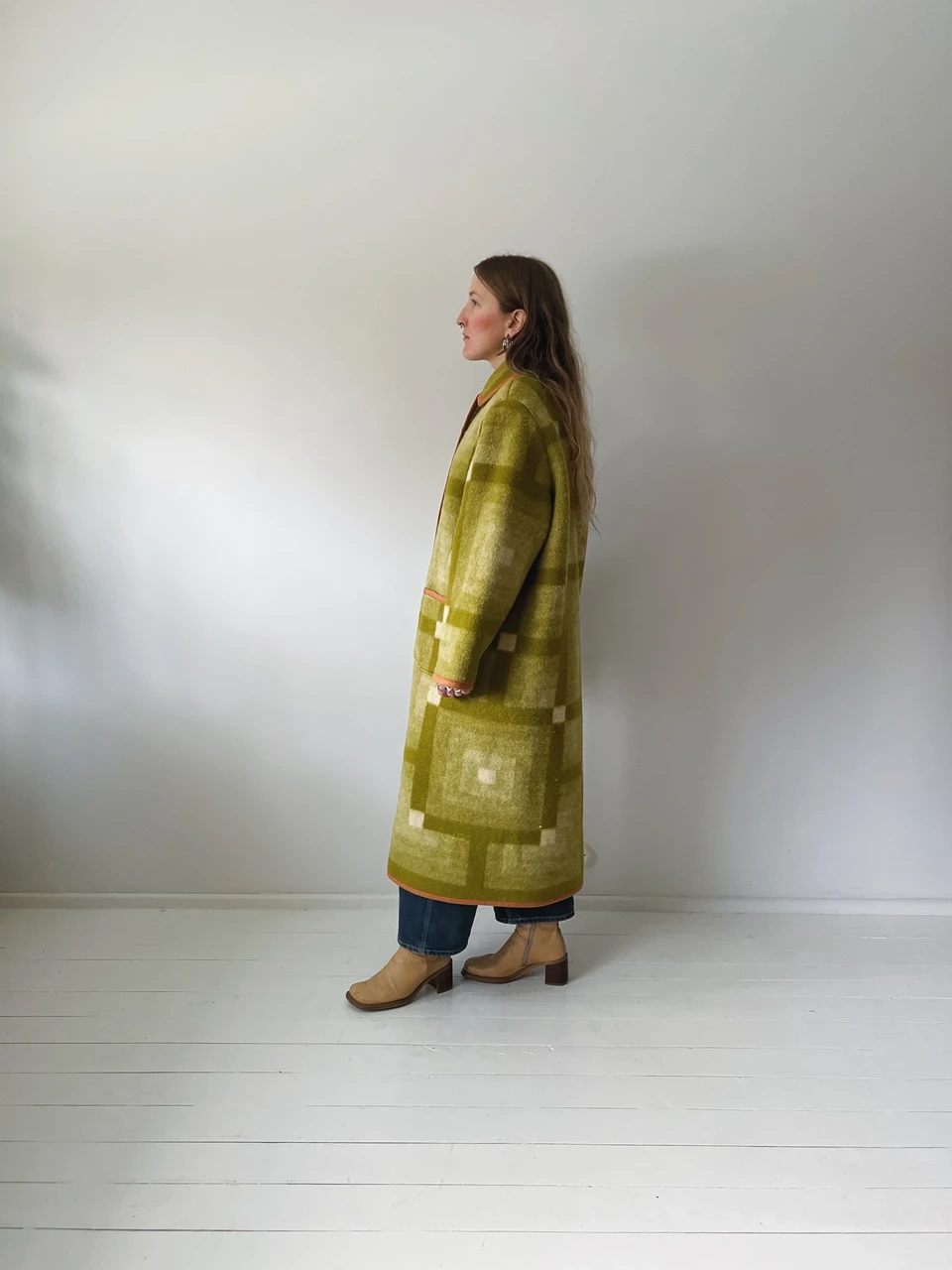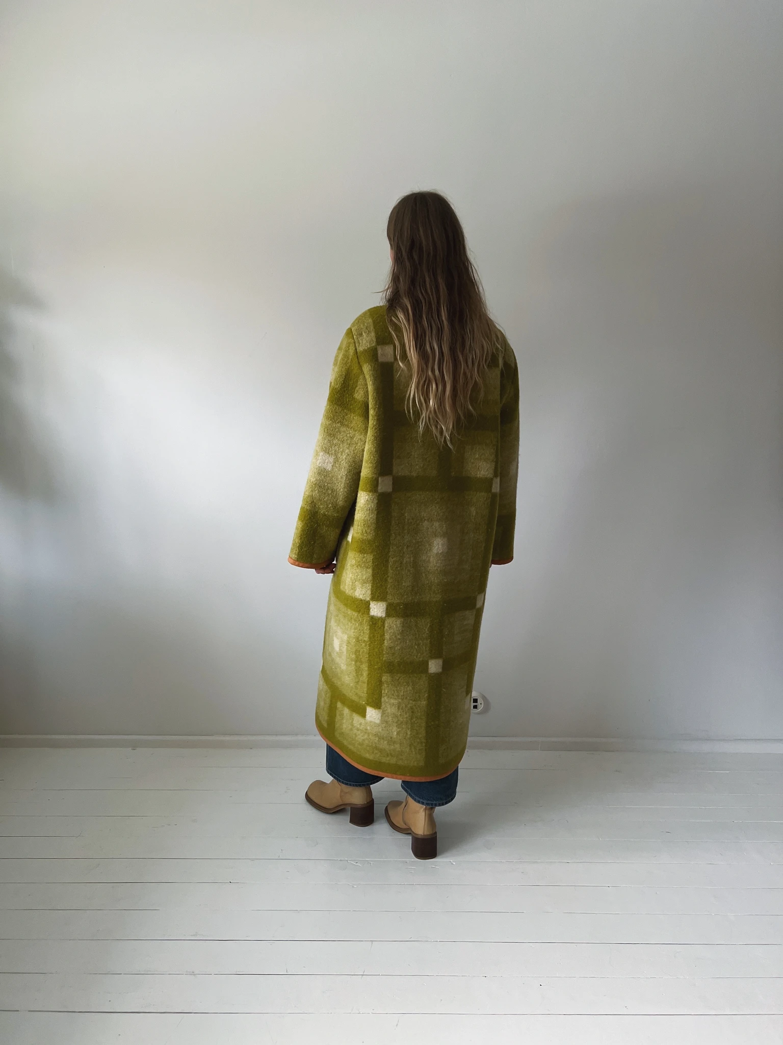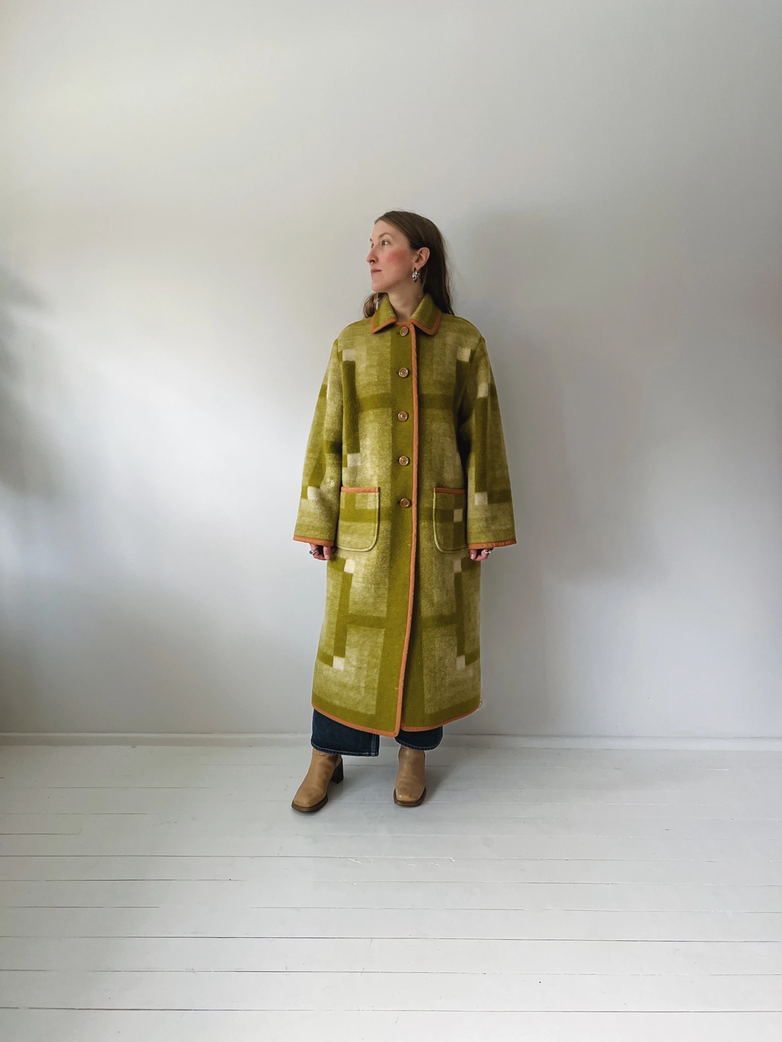PEGGY is an unlined coat that's made from a vintage blanket and is ideal to wear in the chillier months. We have reinforced the edges with binding.