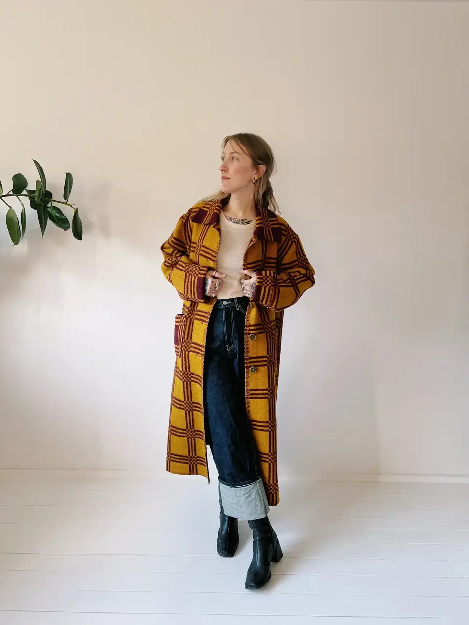 PEGGY is an extra warm unlined long coat that's made from a vintage 100% wool blanket and is ideal to wear in the colder months. We have kept the original hem and finish were possible and handstitched the rest with the utmost care.