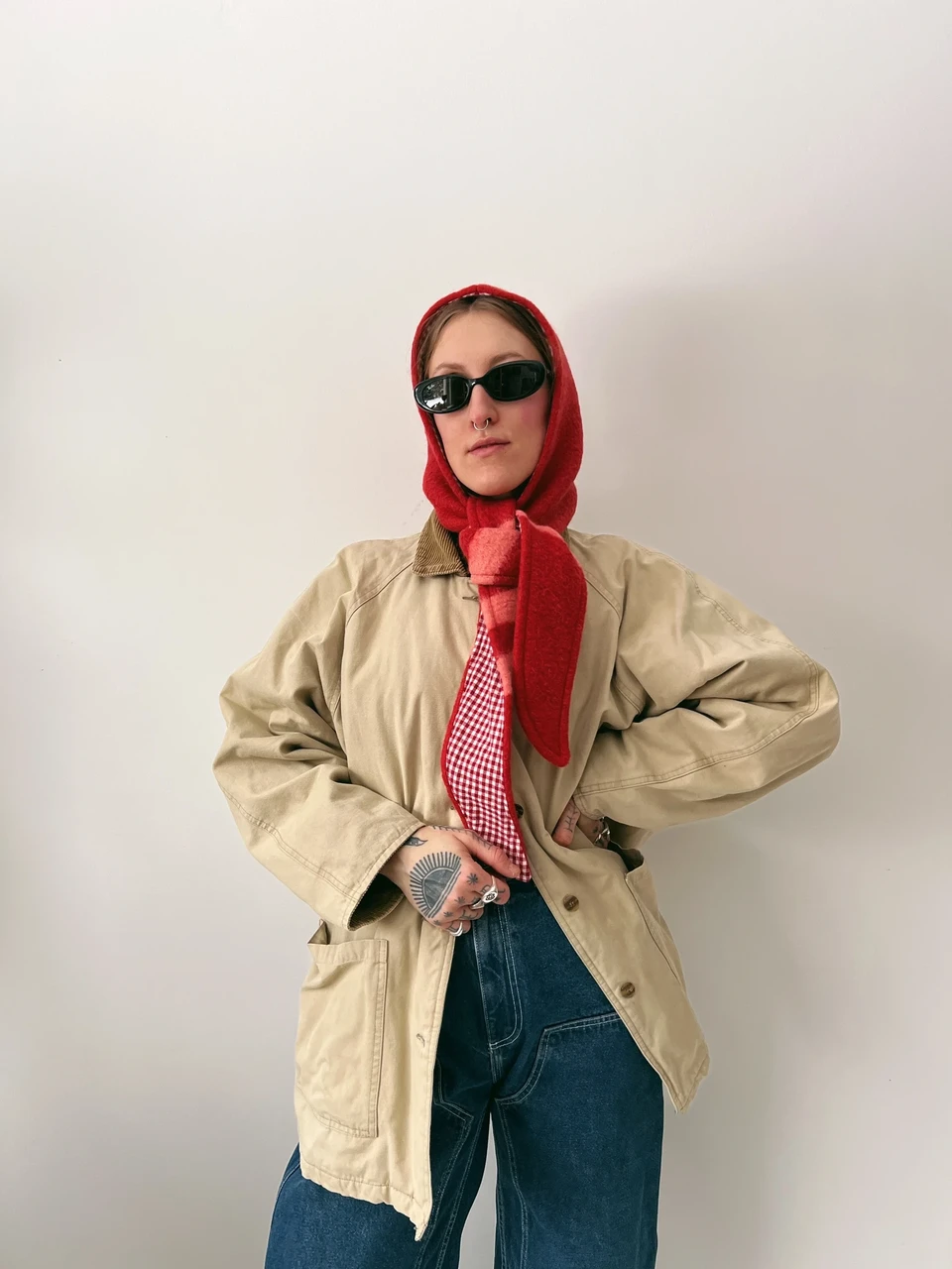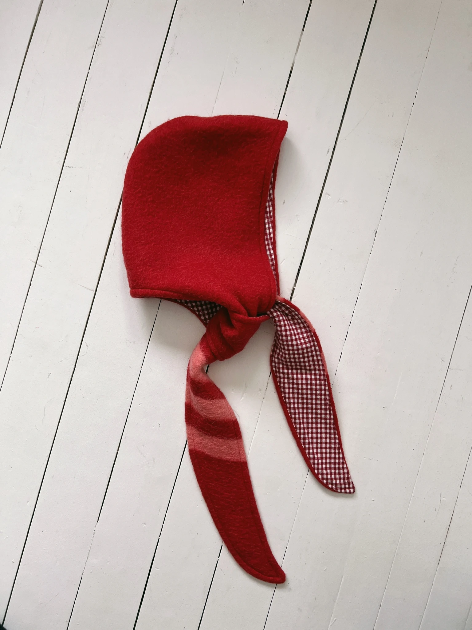 A hood made from a vintage blanket that can be tied in a variety of ways and worn as a stylish and practical accessory to keep your head and neck warm in any weather.