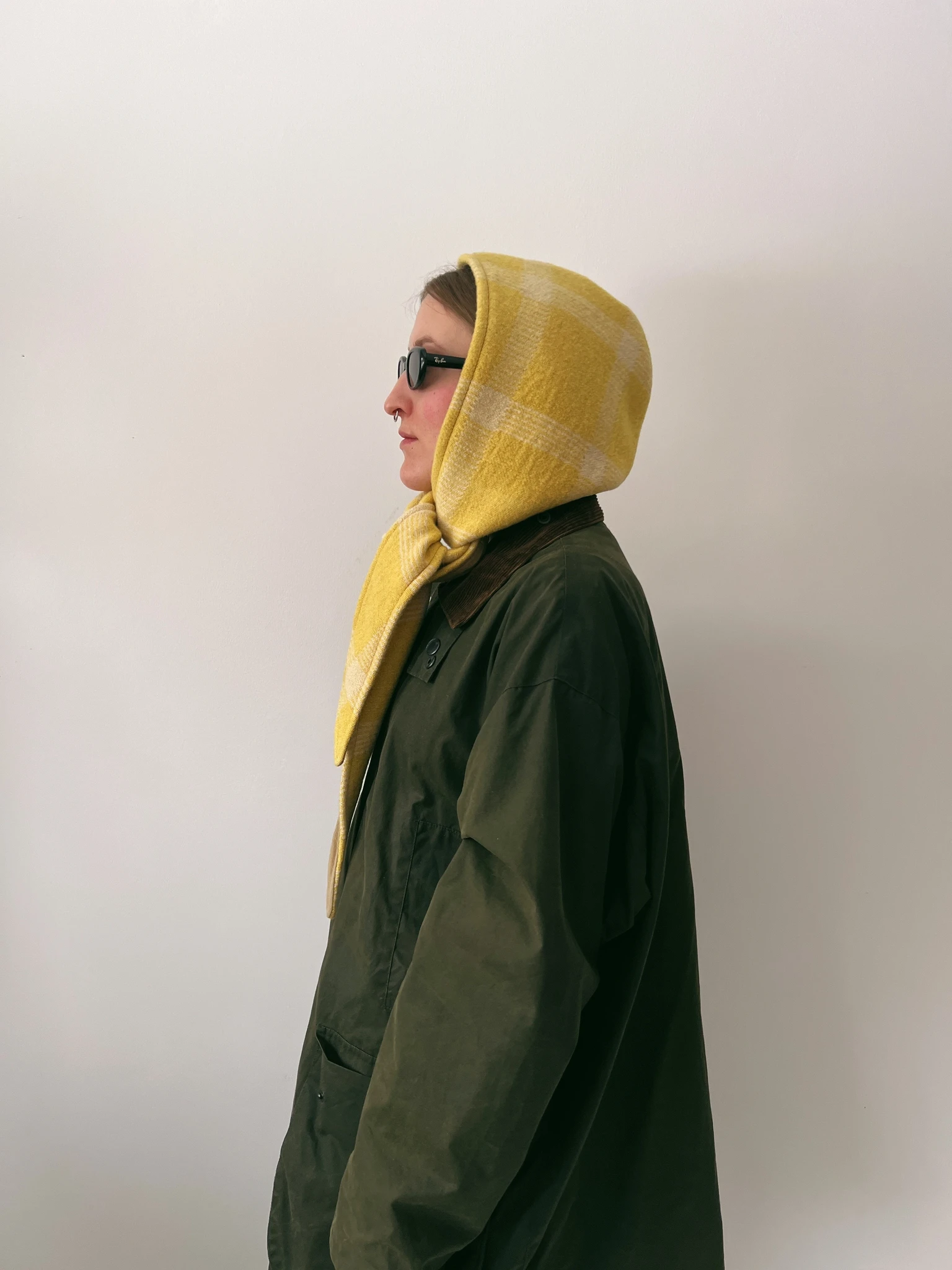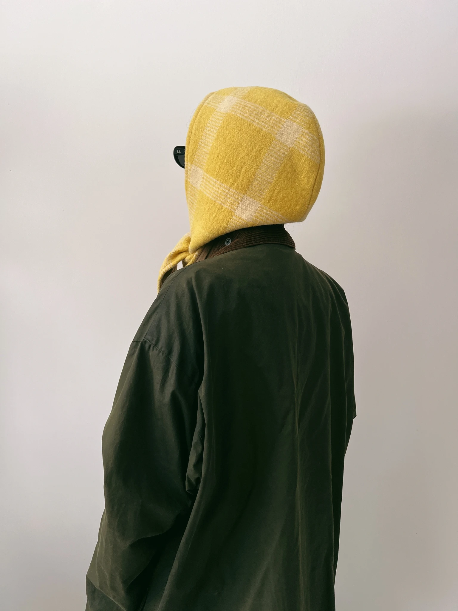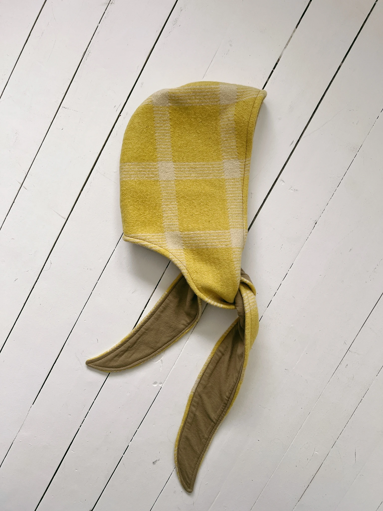 A hood made from a vintage blanket that can be tied in a variety of ways and worn as a stylish and practical accessory to keep your head and neck warm in any weather.