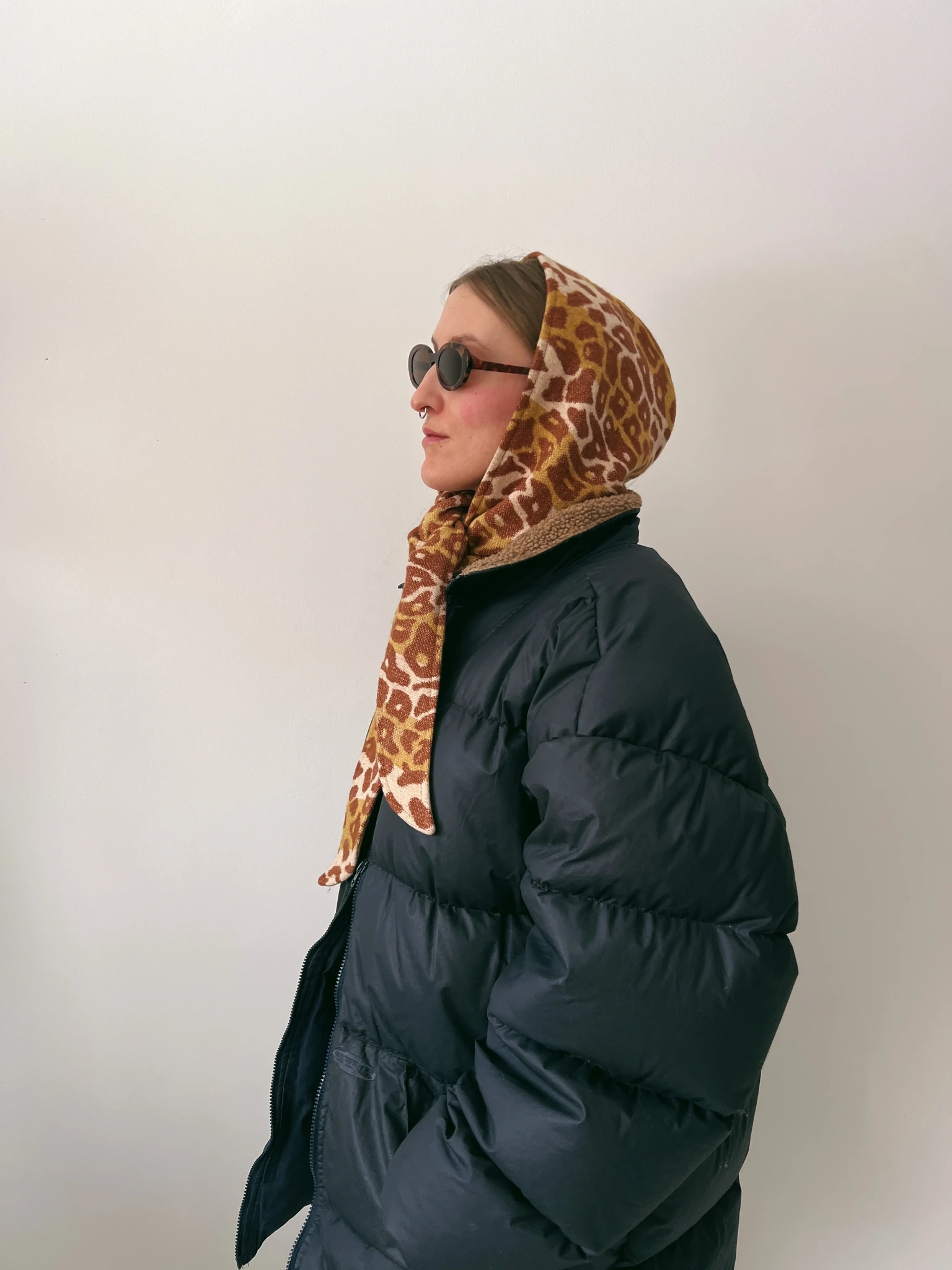 A hood made from a vintage blanket that can be tied in a variety of ways and worn as a stylish and practical accessory to keep your head and neck warm in any weather.