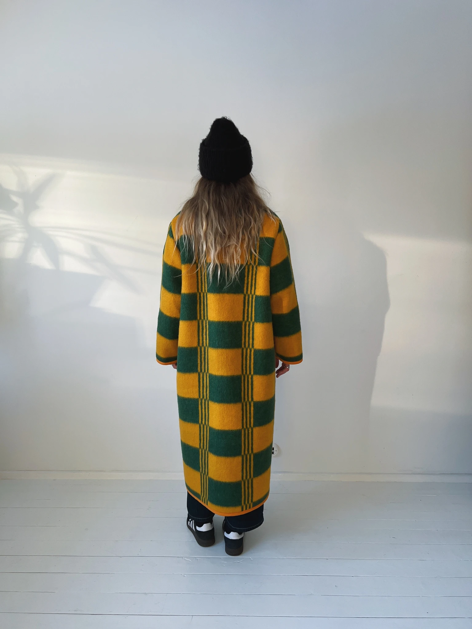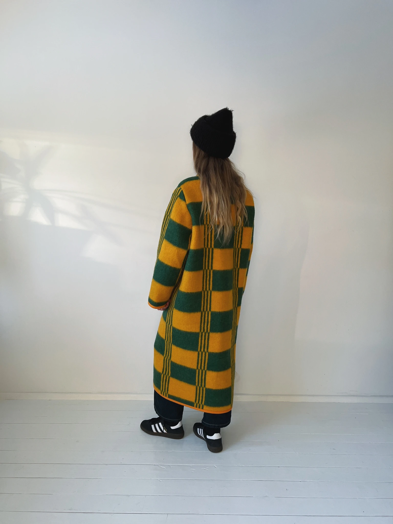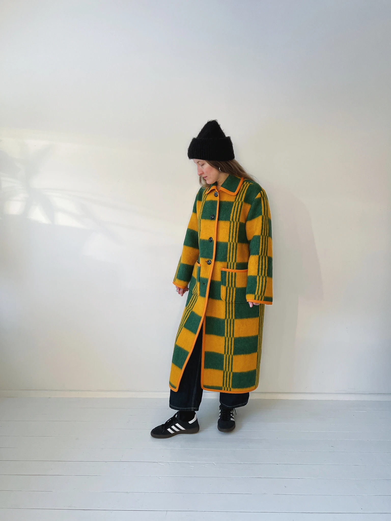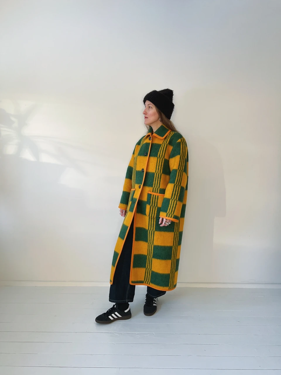 PEGGY is an unlined coat that's made from a vintage blanket and is ideal to wear in the chillier months. We have reinforced the edges with binding.