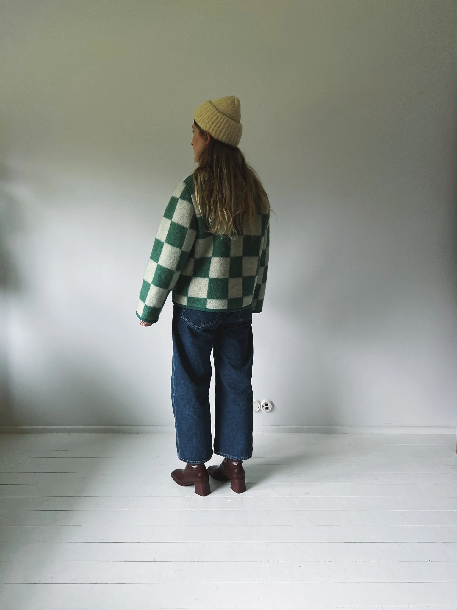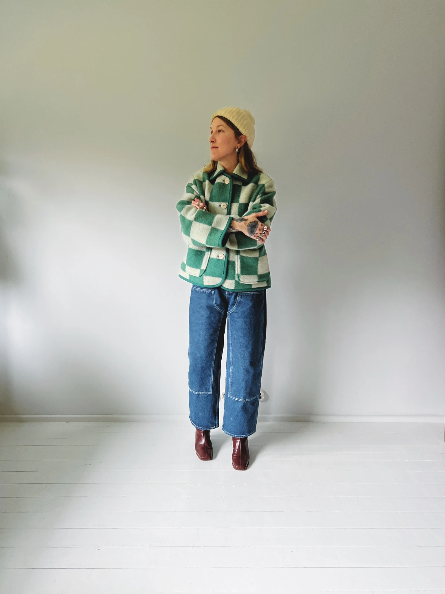 PEGGY is an unlined wool jacket that's made from a vintage wool blanket and is ideal to wear in the chillier months. We used bias tape to finish all the hems.