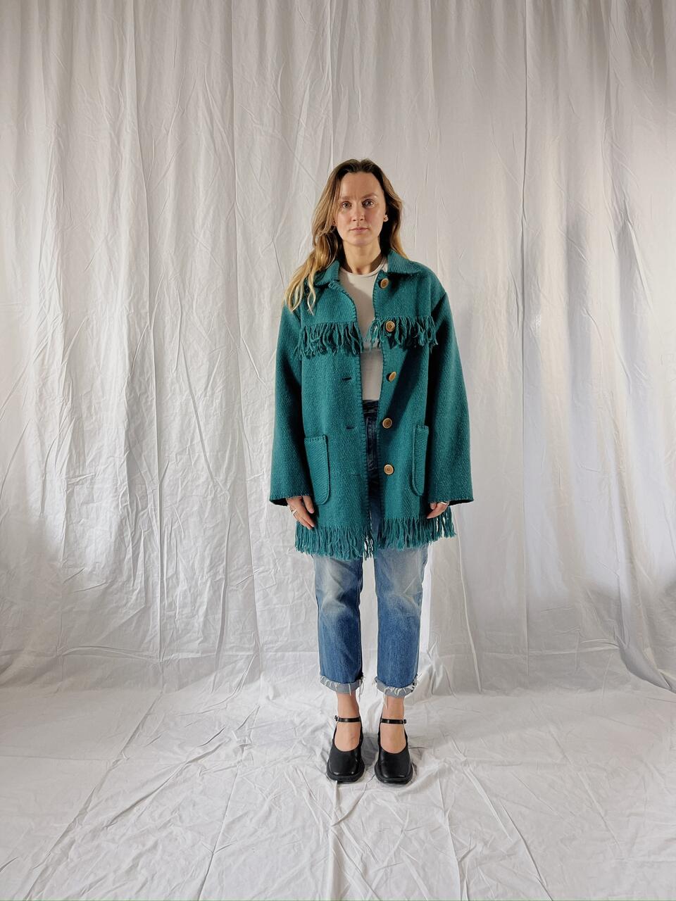 SUE is a lightweight western style jacket made out of a throw blanket. It is unlined and meant to be worn as a light layer in the warmer seasons. We preserved the origina tassels and carefully handstitched the raw edges.