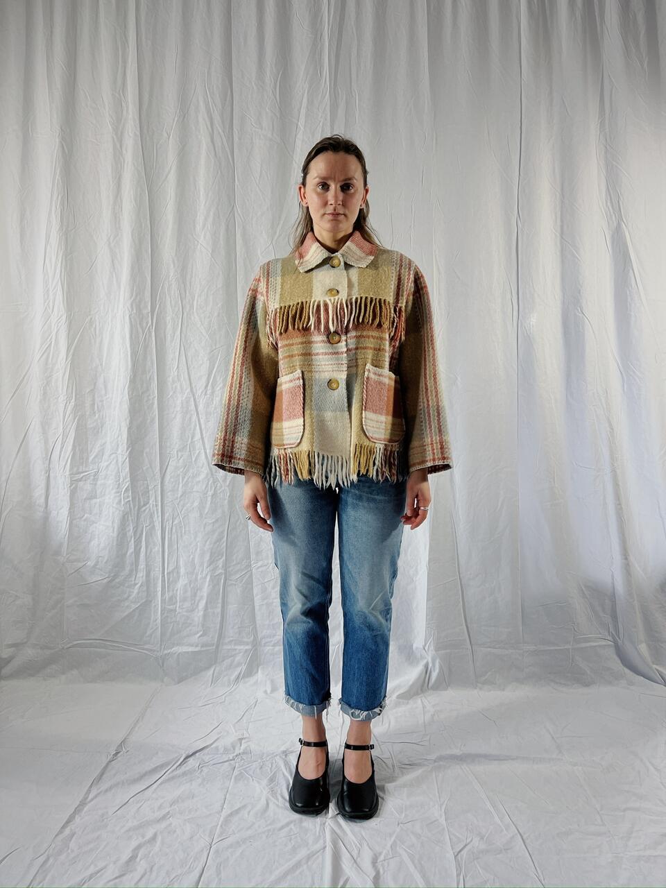 SUE is a lightweight western style jacket made out of a throw blanket. It is unlined and meant to be worn as a light layer in the warmer seasons. We preserved the origina tassels and carefully handstitched the raw edges.