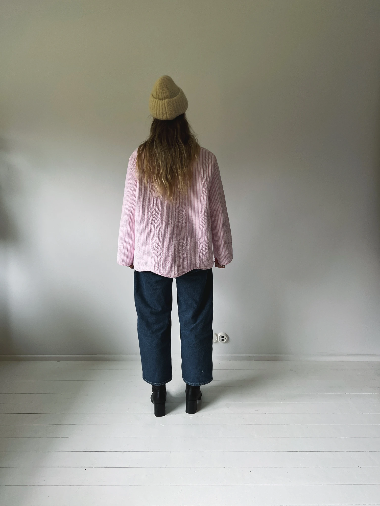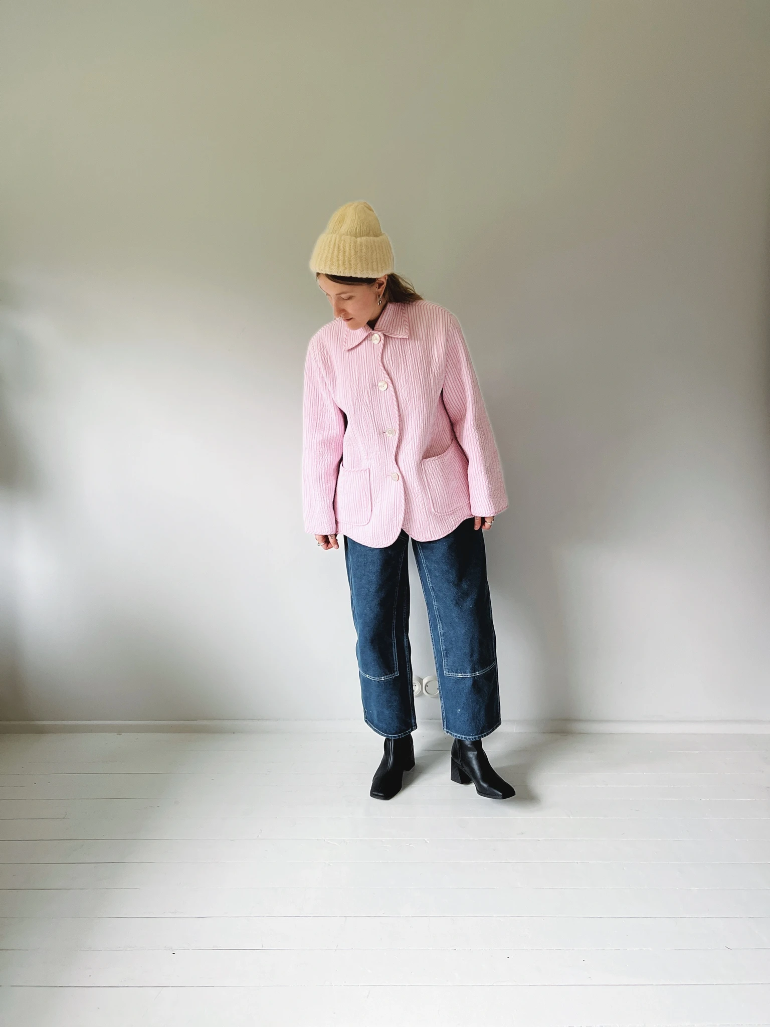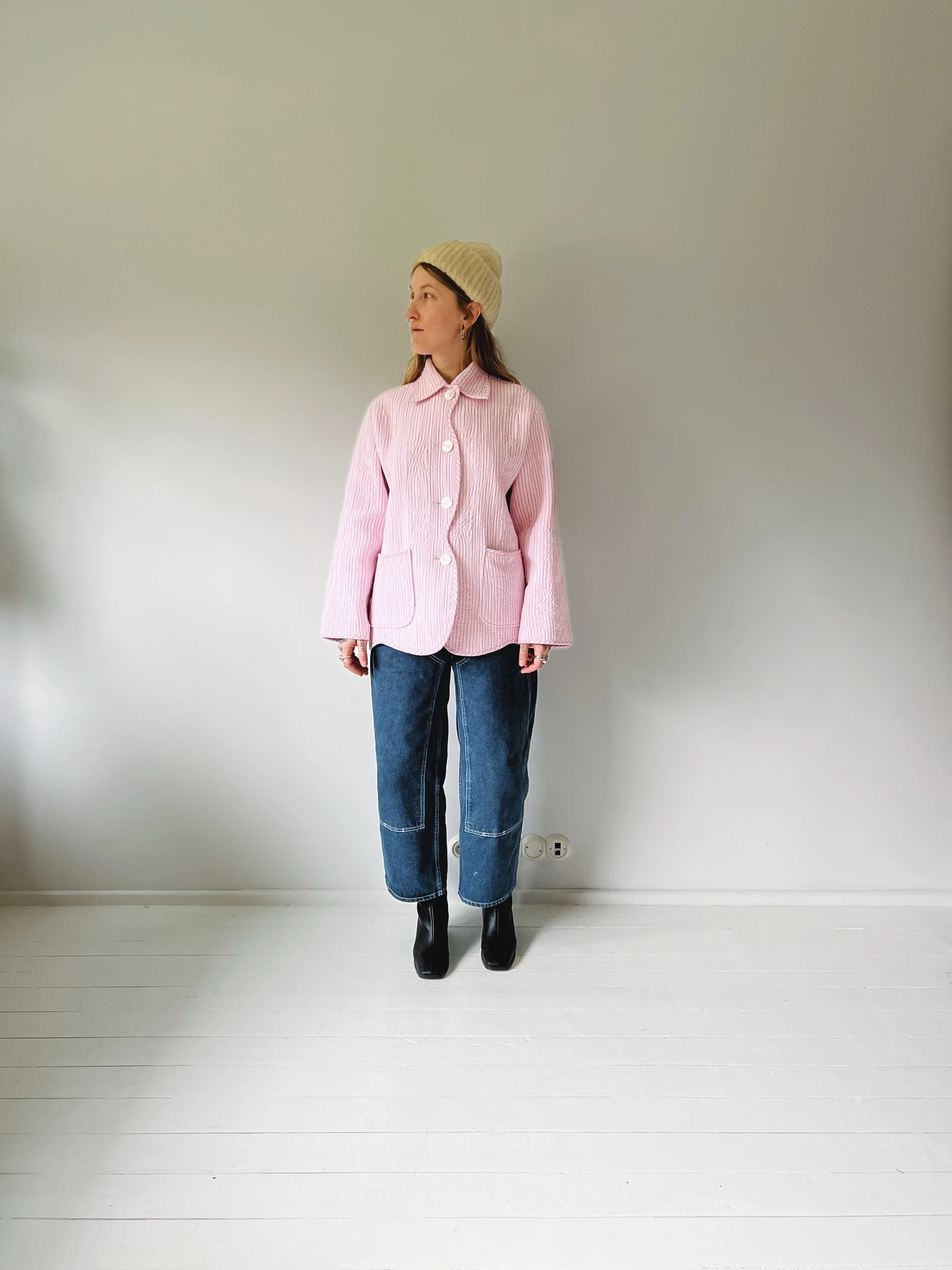 ZOE is a jacket made from a quilted bed spread. It is meant to have an oversized fit and dropped shoulder. The filling is a light polyester batting and is meant for the spring/autumn seasons)