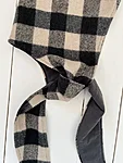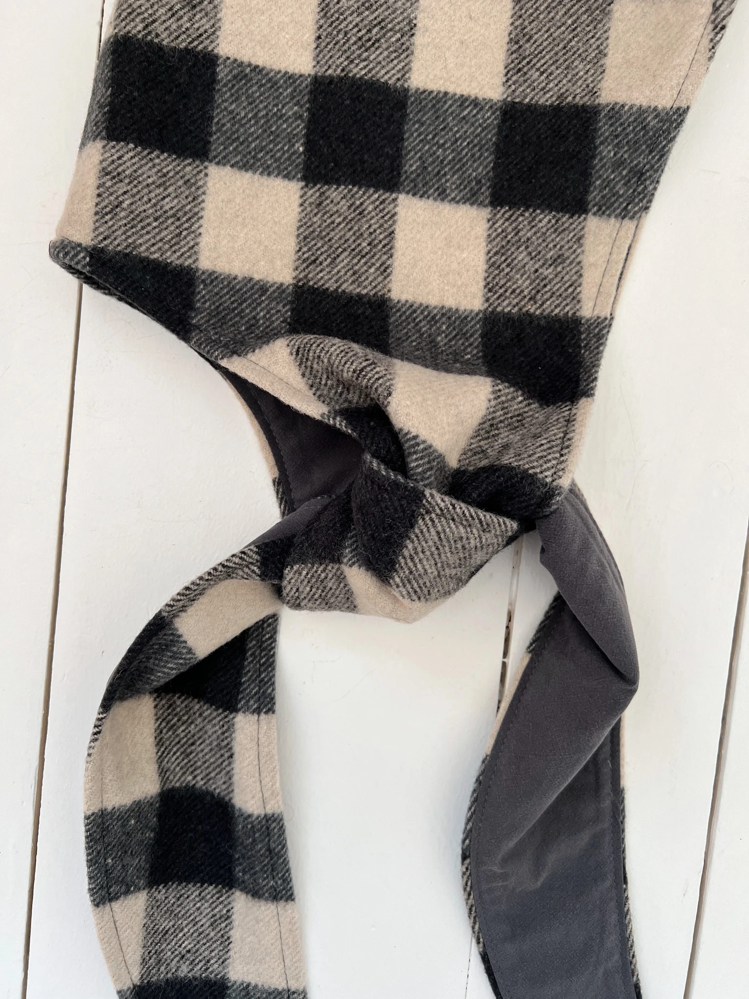 A hood made from a vintage wool fabric that can be tied in a variety of ways and worn as a stylish and practical accessory to keep your head and neck warm in any weather.
